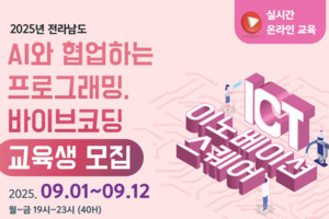 전남정보문화산업진흥원(원장 이인용, 이하 ‘진흥원’)은 오는 9월 전남ICT이노베이션스퀘어에서 인공지능 분야 전문 인재 양성을 위한 실시간 온라인 교육을 운영한다고 밝혔다.과학기술정보통신부와 정보통신산업진흥원이 주관하고 전라남도와 광양시가 지원하는 ICT이노베이션스퀘어 확산사업’의 일환으로 진행되는 이번 교육은 ▲바이브코딩 과정 ▲AWS마스터클래스 과정 ▲ AI에이전트 과정으로 인공지능 분야 총 3개 과정으로 구성된다.바이브코딩 과정과 AI 에이전트 과정은 각각 9월 1일부터 12일, 9월 15일부터 26일까지 총 40시간 동안 운