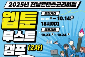 전남정보문화산업진흥원(원장 이인용, 이하 진흥원)이 전남지역 웹툰 창작자 양성을 위한 ‘전남콘텐츠코리아랩 웹툰 부스트 캠프’ 2차 참가자를 오는 10월 14일(화)까지 모집한다고 밝혔다.이번 2차 캠프는 ‘스토리 스타일링’을 주제로, 1차 과정을 통해 선발된 우수 창작자 2명을 포함해 총 13명 내외의 참가자가 함께한다. 시나리오 기초부터 원고 작성 실무, 멘토링 및 작품 스크리닝까지 웹툰 제작의 전 과정을 실전 중심으로 훈련할 수 있도록 구성됐다. 특히, 웹툰 ‘미생’, ‘파인’의 윤태호 작가가 멘토로 참여해 창작 노하우와 업계
