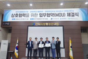 한국지방행정연구원(원장권한대행 주재복)과 전북대학교 행정학과, 전북대학교 부설 공공갈등과 지역혁신 연구소(학과장 및 소장 하동현)는 29일 상호협력을 위한 업무협약을 각각 체결했다.한국지방행정연구원 다산홀에서 진행된 협약식에는 주재복 한국지방행정연구원 원장권한대행과 하동현 행정학과 교수(전북대학교 행정학과장·전북대학교 부설 공공갈등과 지역혁신 연구소장)를 비롯한 협약기관의 주요 관계자들이 참석했다.전북대학교 부설 공공갈등과 지역혁신 연구소는 국무조정실 갈등관리 연구기관으로 지정(2023~2025년)됐다. 이번 업무협약은 지역인재 육