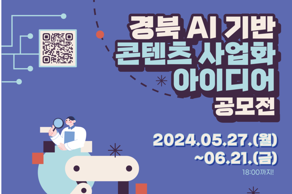 경북문화재단 콘텐츠진흥원(원장 이종수)은 경상북도 내 콘텐츠 산업 인재 발굴 및 양성과 취·창업의 기회를 마련하기 위한 미래 콘텐츠 인재양성 프로그램의 일환으로 ‘경북 소재 인공지능(AI) 기반 콘텐츠 사업화 아이디어 공모전’을 개최한다.