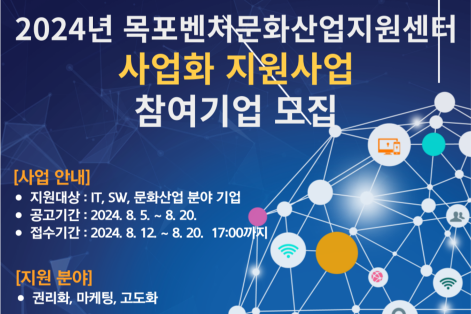 2024년 목포벤처문화산업지원센터 운영 사업의 일환으로 추진되는 이번 사업은 전남 IT·SW·문화산업 분야 기업 대상 단계별 맞춤형 성장 지원한다.