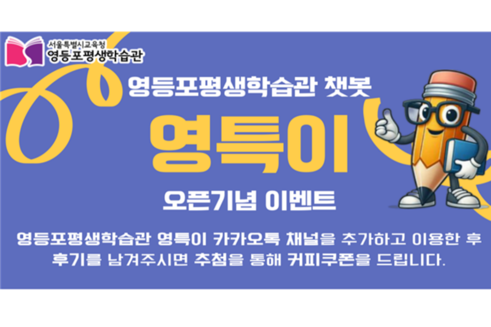 영등포평생학습관에서는 챗봇 ‘영특이’ 오픈 기념으로 이벤트를 준비했다. ‘영특이’ 카카오톡 채널을 추가하고 이용 후기를 남기면 추첨을 통해 기프티콘을 발송할 예정이다.
