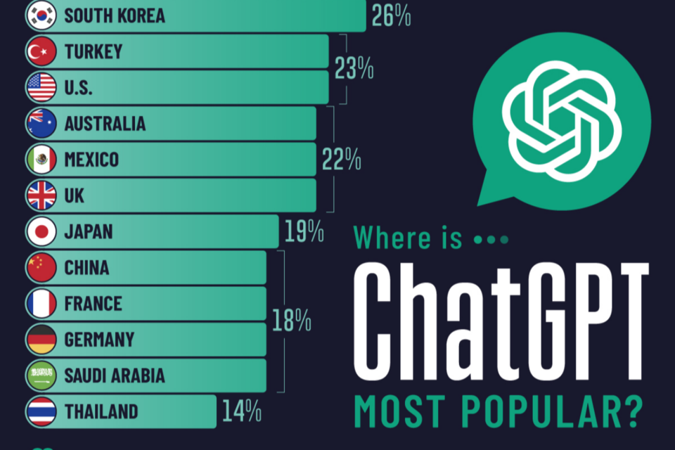 인도에 이어 챗GPT를 업무에 가장 많이 활용하는 국가는 모로코(38%), 아랍에미리트(UAE, 34%), 아르헨티나(32%), 브라질(32%), 인도네시아(32%), 남아프리카공화국(31%), 필리핀(28%), 스웨덴(27%) 순이었다. 한국은 스웨덴에 이어 10위를 기록했다.