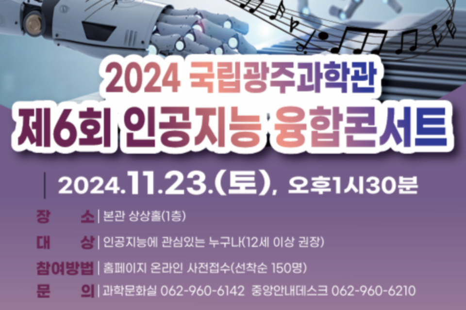 2024 국립광주과학관 제6회 인공지능 융합콘서트 참여와 관련한 자세한 사항은 국립광주과학관 누리집에서 확인할 수 있다.