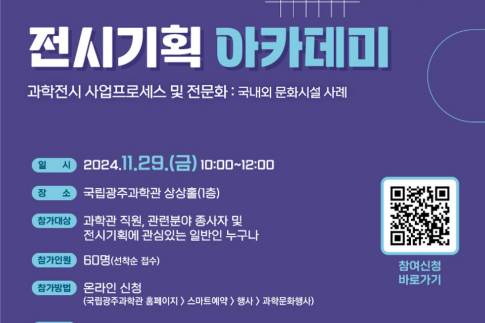 국립광주과학관(관장 이정구)은 오는 29일 전시기획 분야 전문가를 초청하여 제6차 전시기획 아카데미를 본관 1층 상상홀에서 개최한다고 밝혔다.