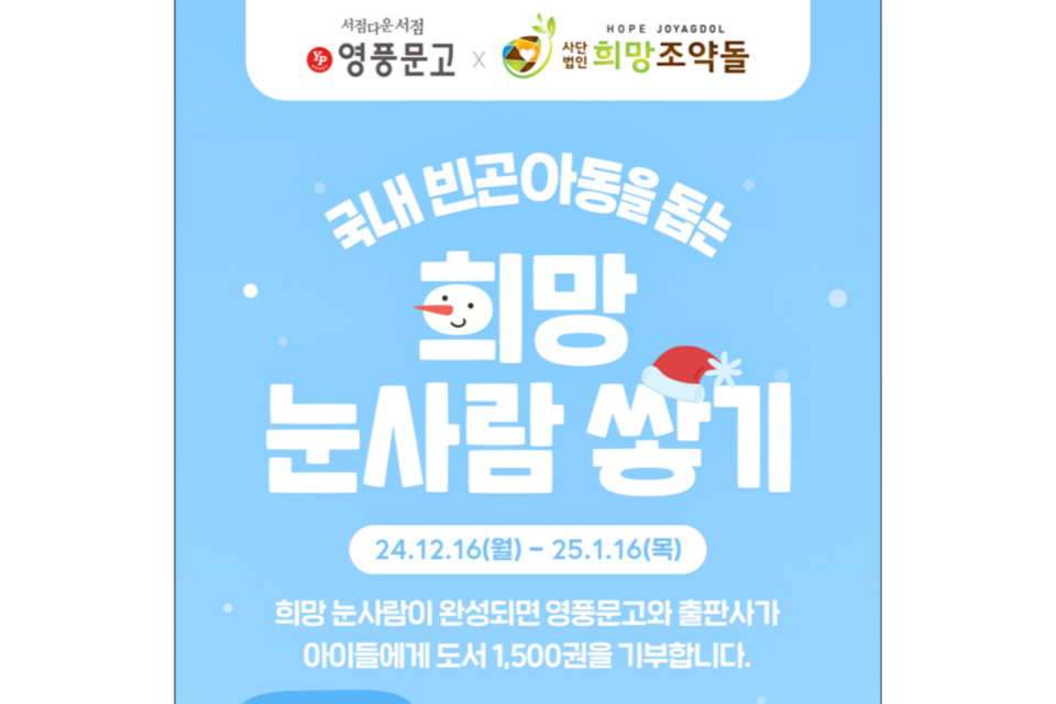 영풍문고(대표이사 김경환)가 연말을 맞이해 희망조약돌과 함께 국내 빈곤 아동을 위한 특별 기부 캠페인에 나선다. 이번 캠페인은 고객들의 참여를 기반으로 이뤄지며, 도서 기부 챌린지인 ‘희망 눈사람 쌓기 이벤트’를 통해 진행된다.