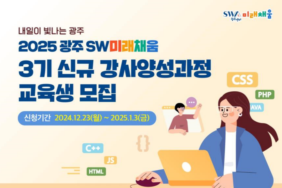 광주정보문화산업진흥원(원장 이경주)은 미래 소프트웨어·인공지능 인재 양성을 위한 2025년 ‘SW 미래채움 강사 양성과정 3기’에 참여할 교육생 40명을 오는 1월 3일까지 모집한다고 밝혔다.