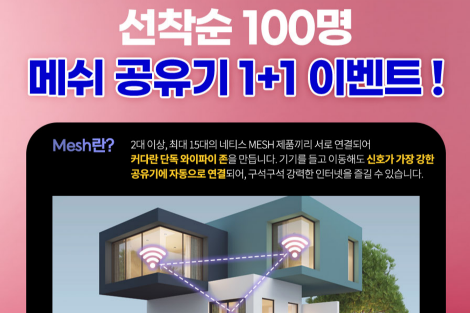 네트워크 전문기업 넷유는 netis(네티스) 브랜드의 와이파이6 공유기 1+1 구매 증정 이벤트를 진행한다. 이번 와이파이6 공유기 1+1 구매 증정 이벤트는 네티스 MEX6000모델을 구매하면 네티스 MEX602 모델을 추가 증정하는 행사로, 한정 수량 100대 소진 시까지 진행한다.