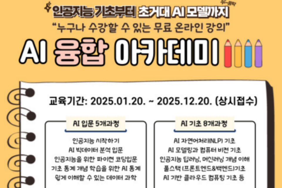 ‘AI 융합아카데미’는 AI 초보자부터 전문가까지 맞춤형 교육을 제공하며, 최신 AI 기술 트렌드를 반영한 세미나도 함께 운영된다. 모든 강의는 온라인으로 제공돼 누구나 시간과 장소에 구애받지 않고 자유롭게 학습할 수 있다.