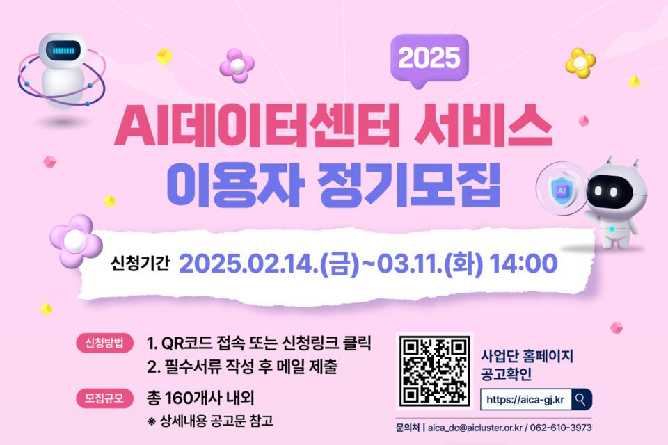 신청 기간은 오는 3월 11일 오후 2시까지이며, 자세한 사항은 인공지능산업융합사업단 홈페이지에서 확인할 수 있다. 신청을 원하는 기관은 신청서 및 증빙서류를 작성해 이메일(aica_dc@aicluster.or.kr)로 제출하면 된다.