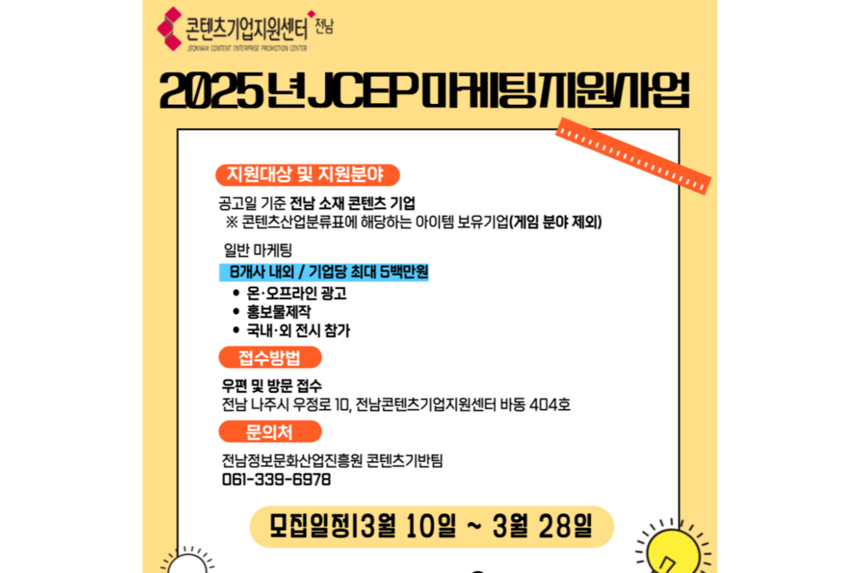 전남정보문화산업진흥원(원장 이인용)은 7일 전라남도 내 우수콘텐츠의 시장경쟁력 강화와 콘텐츠 기업의 새로운 판로개척을 위한 ‘JCEP 마케팅 지원사업’에 참여할 기업을 모집한다고 밝혔다.