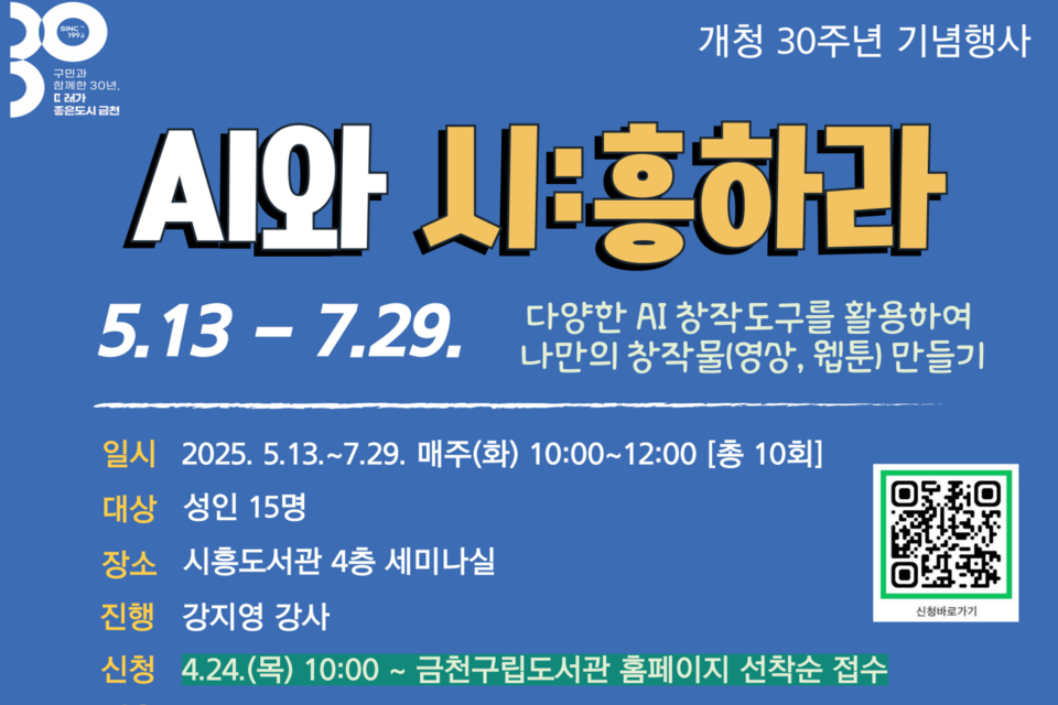 금천문화재단(대표이사 서영철) 금천구립시흥도서관은 오는 5월 13일부터 인공지능(AI)을 활용해 나만의 창작물을 만들어보는 ‘AI와 시:흥하라’를 운영한다고 밝혔다.