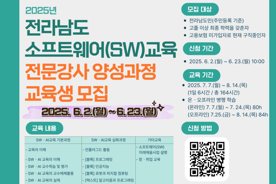전남정보문화산업진흥원(원장 이인용, 이하 진흥원)은 도내 SW교육 격차 해소와 SW·AI 교육 생태계 조성을 위해 '2025년 전라남도 소프트웨어(SW)교육 전문강사 양성과정' 교육생을 모집한다고 6월 2일 밝혔다.