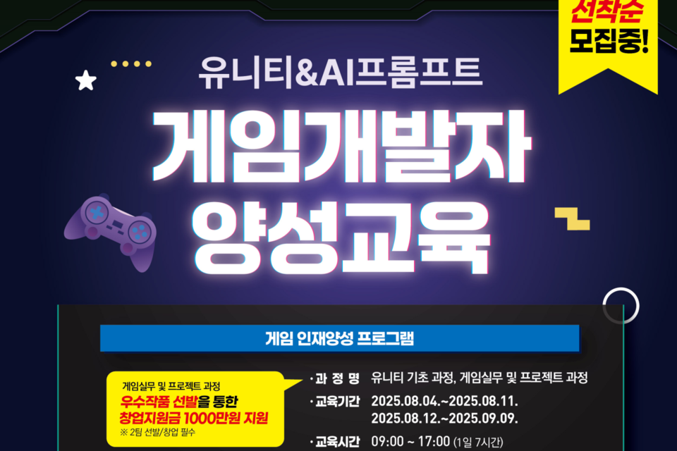 게임분야 취·창업 희망자를 위한 Unity 기초 교육, 게임 실무 프로젝트 교육은 8월부터 9월까지 운영되며, 각 과정에 20명씩 모집할 계획이다. 특히, Unity 교육은 8월 4일부터 9월 9일까지 목포에서 진행되며, 기초 이론부터 게임 프로젝트 실습까지 전 과정을 포함한다. 우수 프로젝트를 제출한 2개 팀에게는 팀당 1,000만 원의 창업지원금이 제공된다.