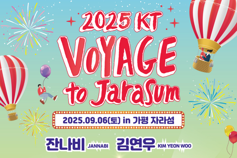 KT가 오는 9월 6일 경기도 가평군 자라섬에서 열리는 대규모 음악 축제 ‘2025 KT 보야지 투 자라섬’(2025 KT VOYAGE to Jarasum, 이하 보야지 투 자라섬) 티켓을 오늘(11일) 오픈한다고 밝혔다.