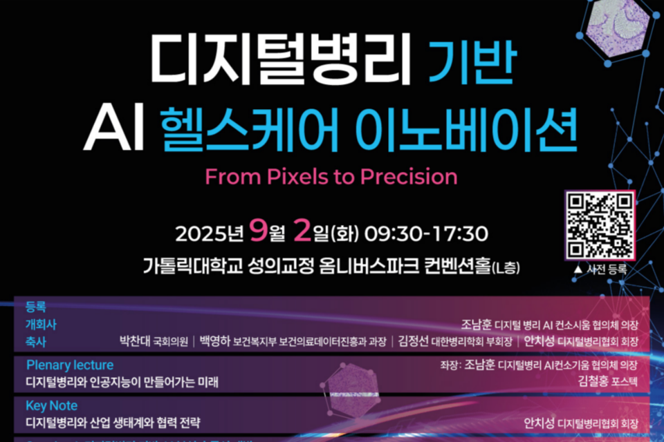 디지털병리협회(협회장 안치성)는 ’디지털병리 기반 AI 헬스케어 이노베이션’을 오는 9월 2일 가톨릭대학교 성의교정 옴니버스파크 컨벤션홀에서 개최한다고19일에 밝혔다.