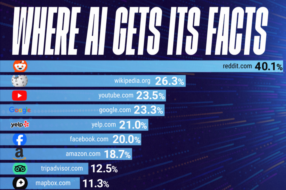위키피디아는 26.3%로 그 뒤를 이었다. 이는 거대언어모델(LLM)이 개방형 토론 공간과 커뮤니티에서 관리하는 콘텐츠에 얼마나 의존하는지를 보여준다. 해당 사이트들은 사용자들이 생성한 풍부한 지식을 제공하지만, 편집이 자유롭다는 점에서 정확성과 편향성에 대한 우려도 제기된다.