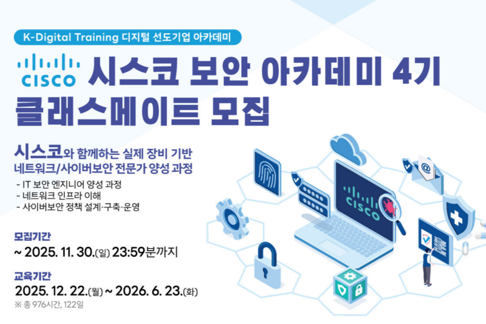 시스코 보안 아카데미 4기 프로그램은 네트워크 및 사이버 보안 전문가 양성을 목적으로 2025년 12월 22일(월)에 시작되어 2026년 6월 23일(화)까지 6개월(총 976시간) 동안 ICT폴리텍대학(경기도 광주시 소재)에서 진행한다. 교육생들에게 실제 산업 환경에서 요구하는 기술력을 갖춘 인력을 배출하는 것을 목표로 네트워크 기초와 함께 물리적 보안/사이버 보안 등 현대 IT 보안의 주요 분야에 대한 심도 있는 교육을 제공할 예정이다.